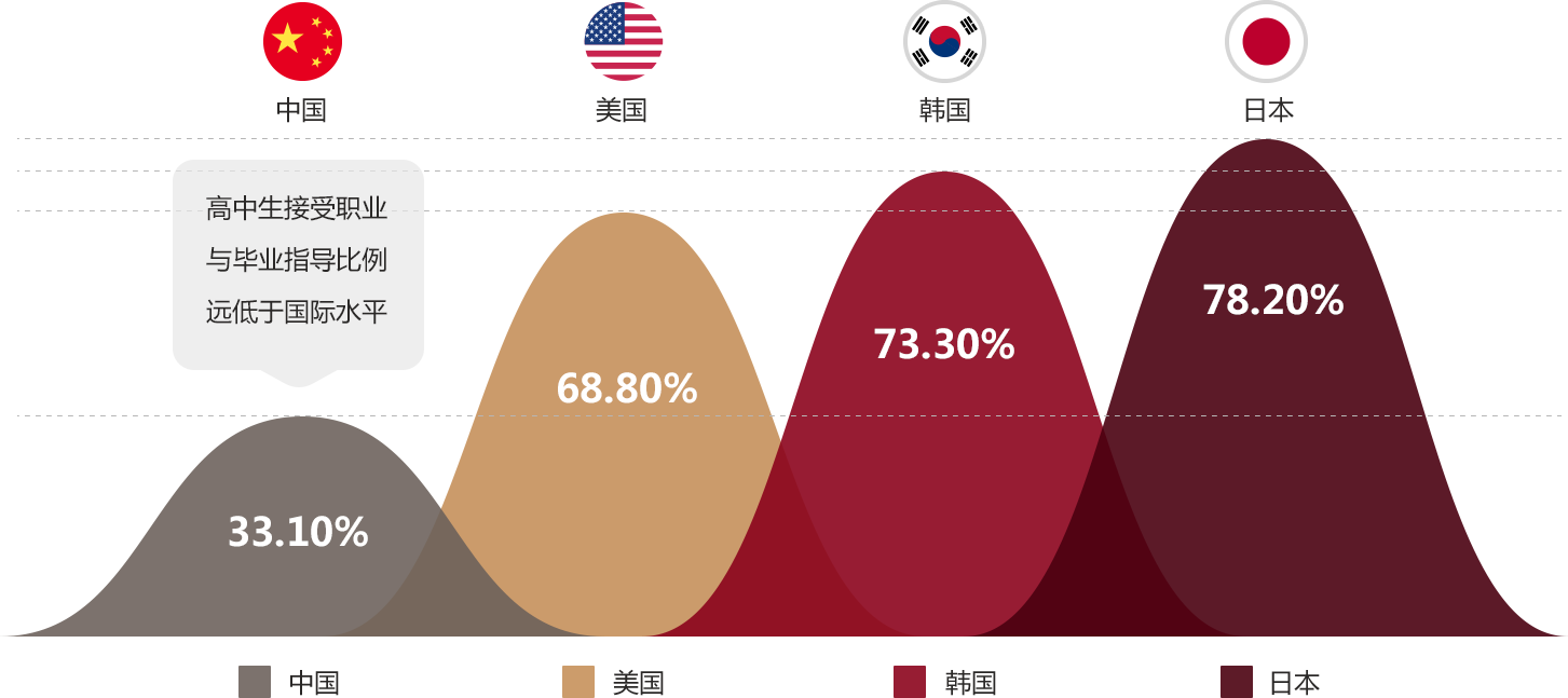 中国青少年研究中心联合日、美、韩发起对四国高中生的毕业去向和职业生涯教育为主题的比较研究,《中美日韩高中生毕业去向和职业生涯教育研究报告》揭示:中国高中生的职业生涯教育已经全面落后于其他三个国家,进而导致中国高中生在毕业去向及职业选择上,出现许多令人担忧的问题。